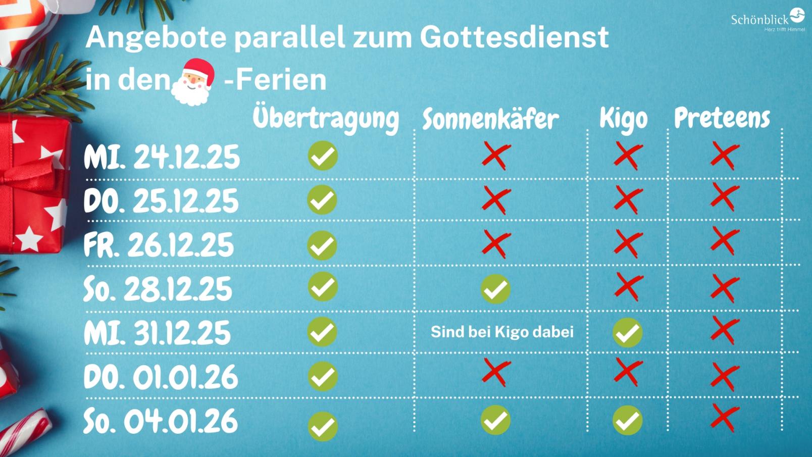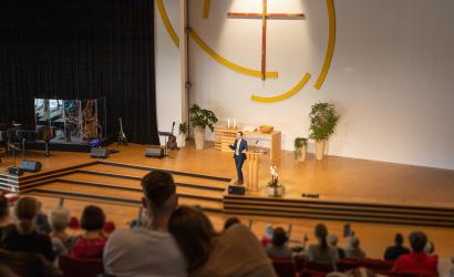 Jeden Sonntag um 10 Uhr mit allen Generationen Gottesdienst feiern im Forum Schönblick: Klein und Groß, Jung und Alt, für alle Mitglieder, Freunde, Nachbarn, Interessierte und Gäste des Schönblicks. Gemeinsam mit ungefähr 500 Gottesdienstbesuchern Gemeinschaft erleben, Gott begegnen, Jesus feiern mit bekannten und modernen Liedern, im Gebet Gott Danke sagen und Stärkung erfahren, mutmachende Predigten und Impulse für den Alltag bekommen.
